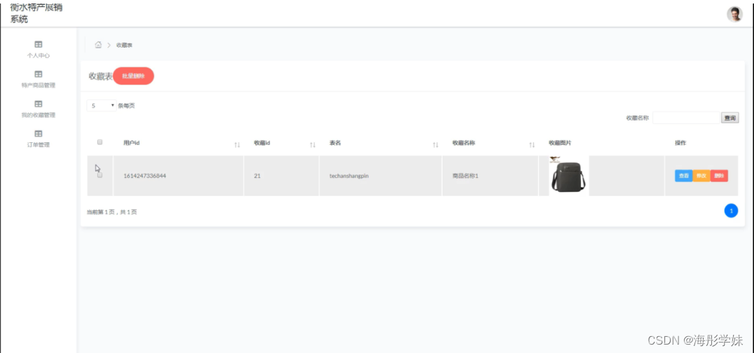 我的收藏管理,在我的收藏管理页面中可以对用户id、收藏id、表名、收藏名称、收藏图片等信息进行查看、修改或删除等操作,如图5-9所示。