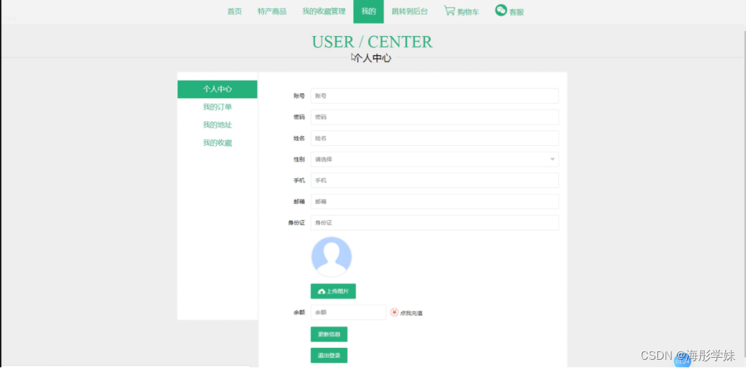 我的,在个人中心页面通过填写账号、密码、姓名、性别、手机、邮箱、身份证、上传图片、余额等信息进行更新信息,根据需要对我的订单、我的地址、我的收藏等进行相应操作,如图5-4所示。