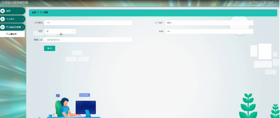 用户登录系统后可以对主首页,个人中心,自习室租赁管理等功能进行操作。