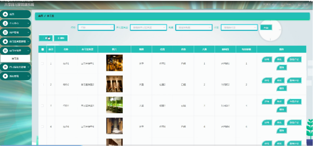 自习室管理,在自习室管理页面可以对名称,自习室类型,图片,规模,位置,状态,人数,时间段,每时价格等内容进行查看,修改,查看评论和删除操作,如图5-12所示。