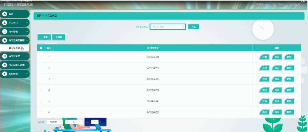 自习室类型管理,在自习室类型管理页面可以对自习室类型进行查看,修改,删除操作,如图5-11所示。