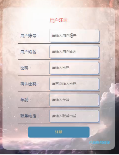 用户注册,在用户注册页面通过填写用户账号,用户姓名,密码,确认密码,年龄,联系电话等信息进行注册操作;如图5-2所示。
