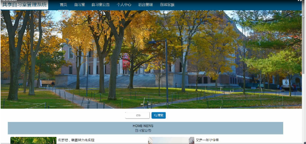 共享自习室管理系统,在系统首页可以查看首页,自习室,自习室公告,个人中心,后台管理,在线客服等内容,并进行详细操作;如图5-1所示。