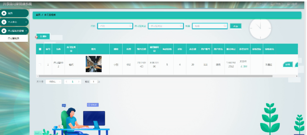 自习室租赁管理,在自习室租赁管理页面可以对名称,自习室类型,图片,规模,位置,预约日期,使用时间段,每时价格,时长,总金额,用户账号,用户姓名,联系电话,是否支付,审核回复,审核状态等内容进行详情,修改和删除等操作,如图5-7所示。
