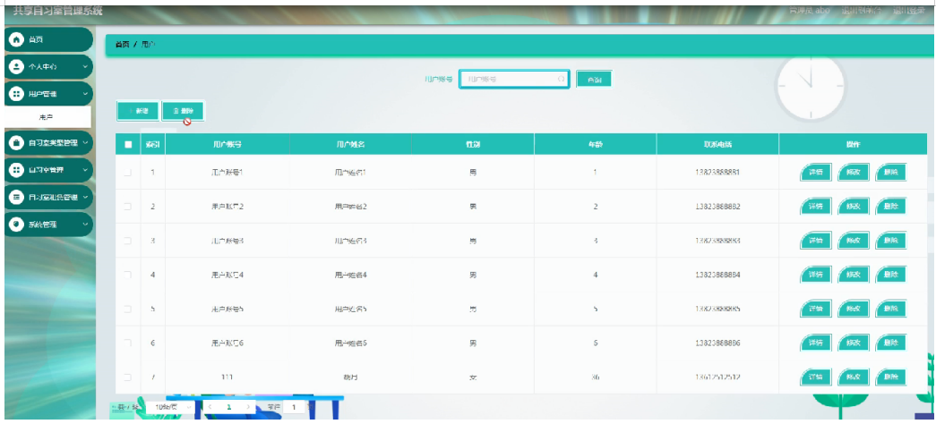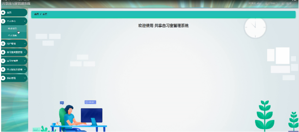用户登陆系统后,可以查看 首页,个人中心,自习室租赁管理等功能,还能对每个功能逐一进行相应操作,如图5-5所示。