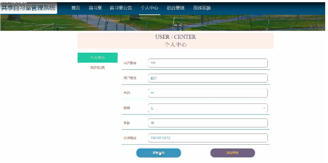 个人中心,在个人中心页面可以对用户账号,用户姓名,密码,性别,年龄,联系电话等内容进行详情,修改操作,如图5-6所示。