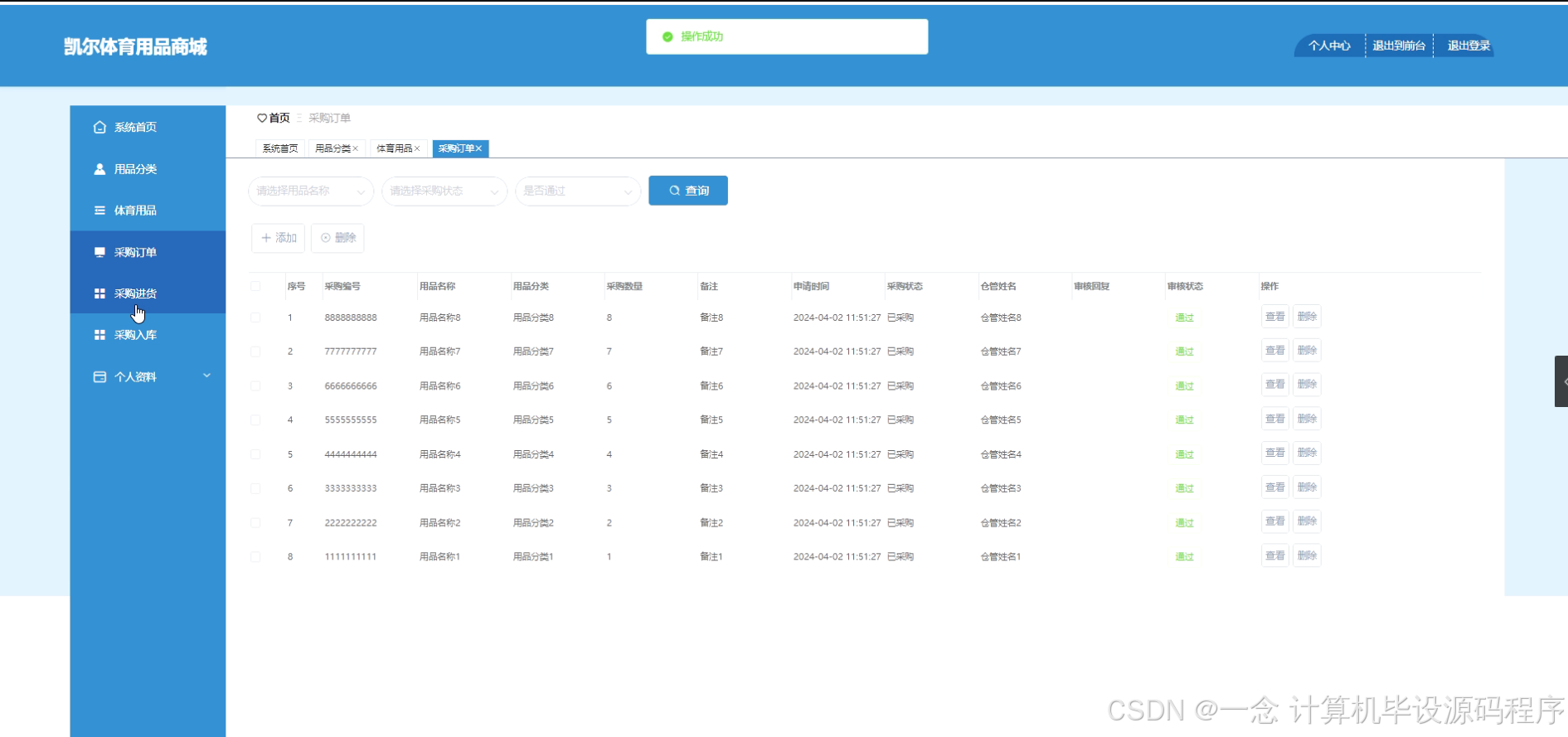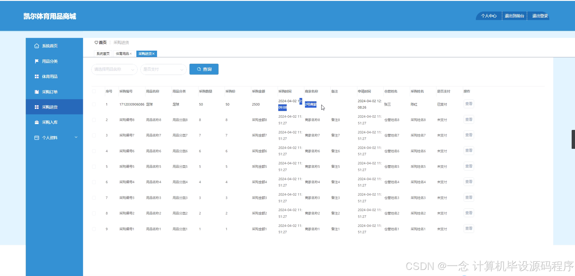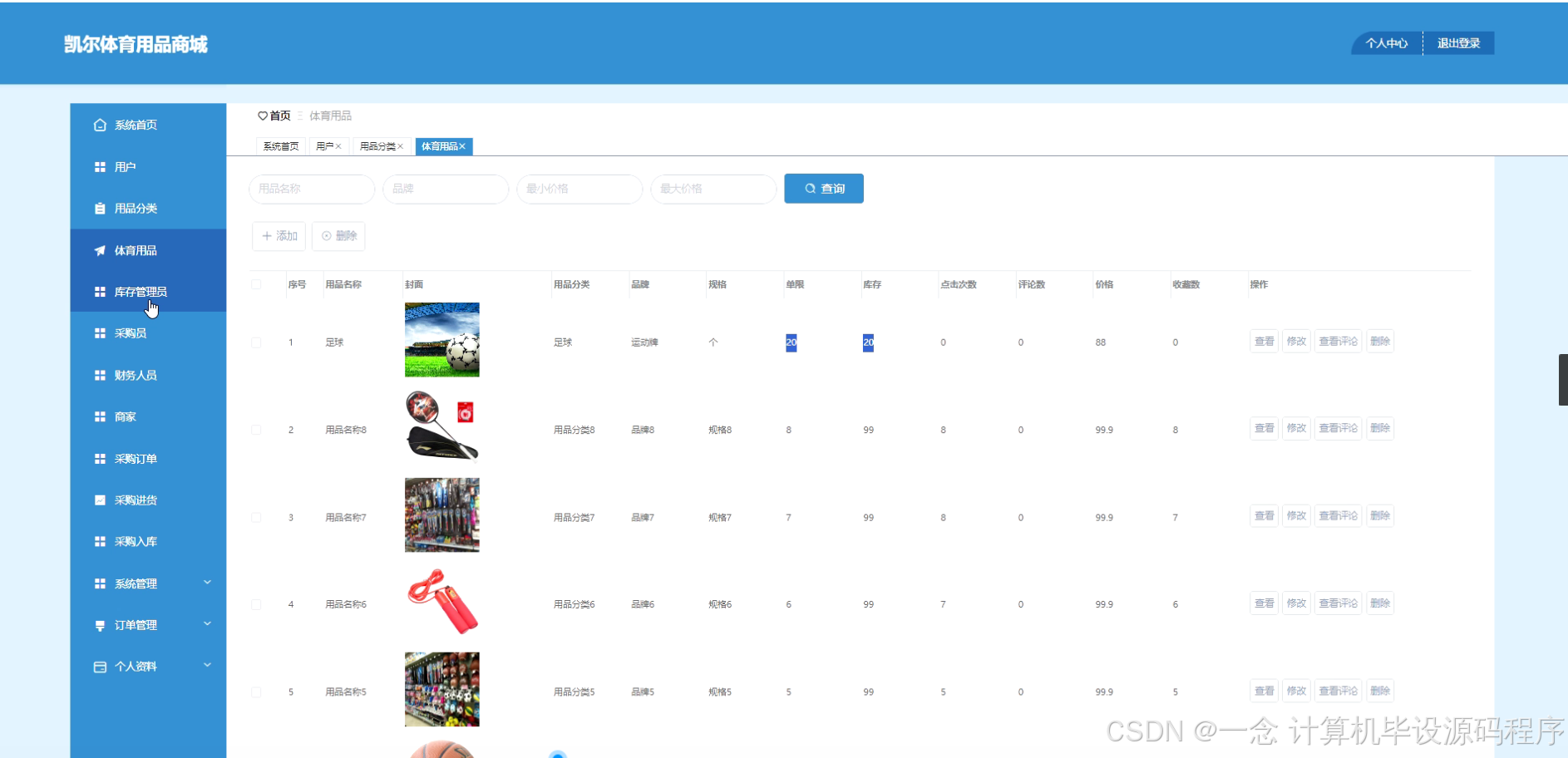 - 开发出一个基于Python的凯尔体育用品商城的系统原型,该原型具备用户、用品分类、体育用品、库存管理、采购、财务、商家、物流等基本功能模块,并且各个模块之间能够协调工作。