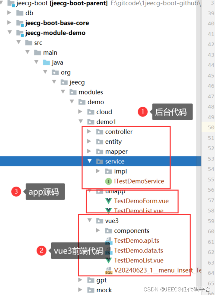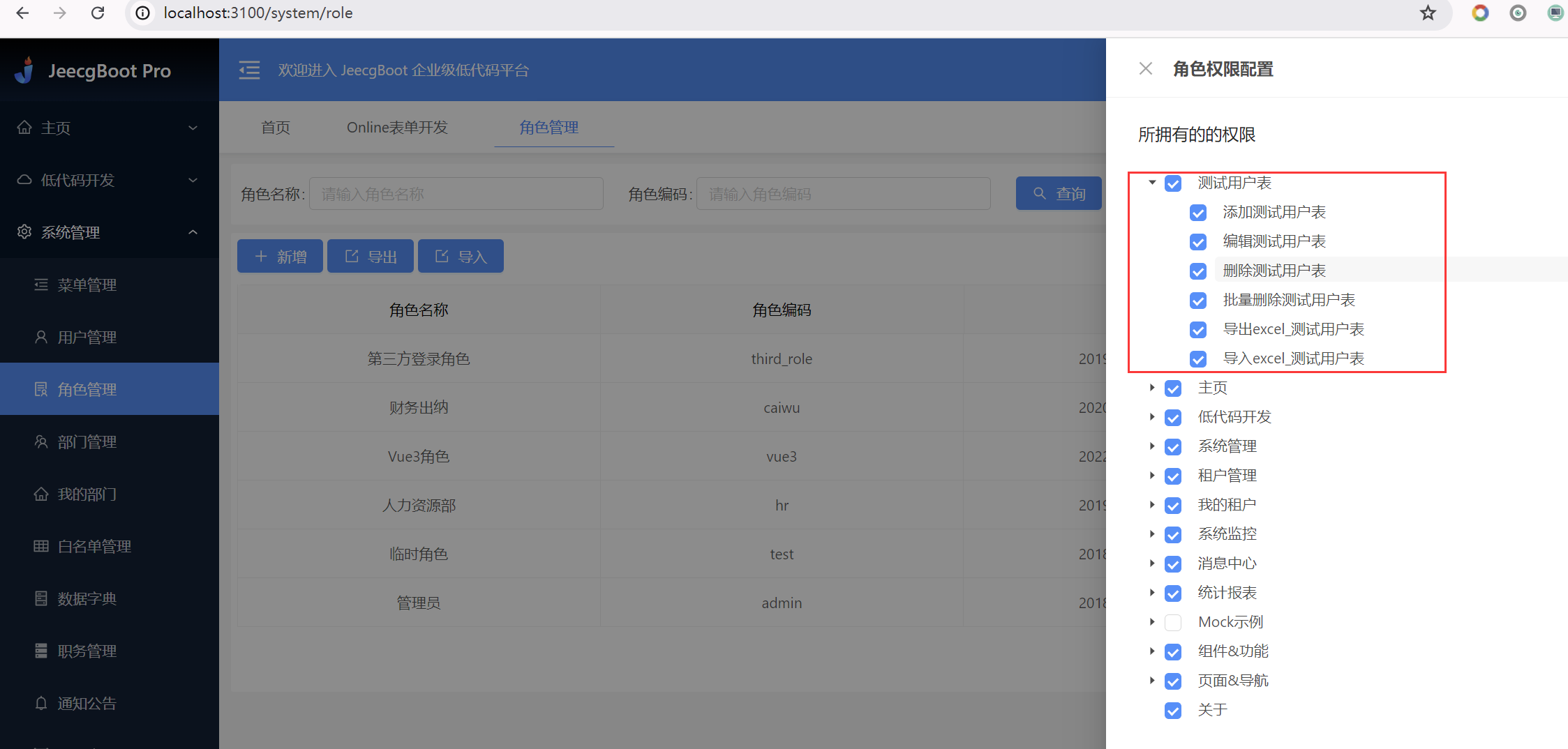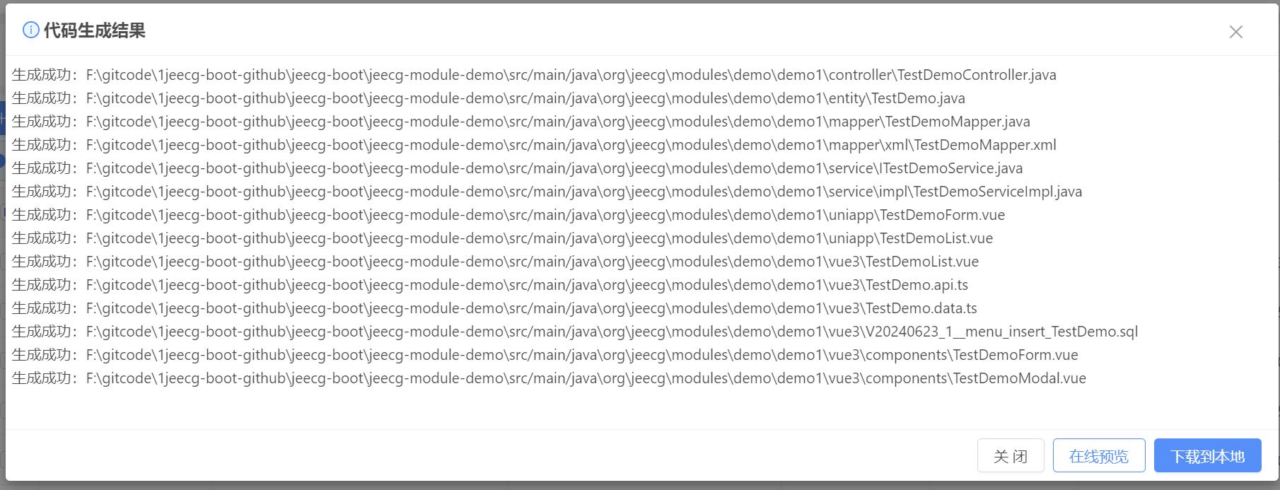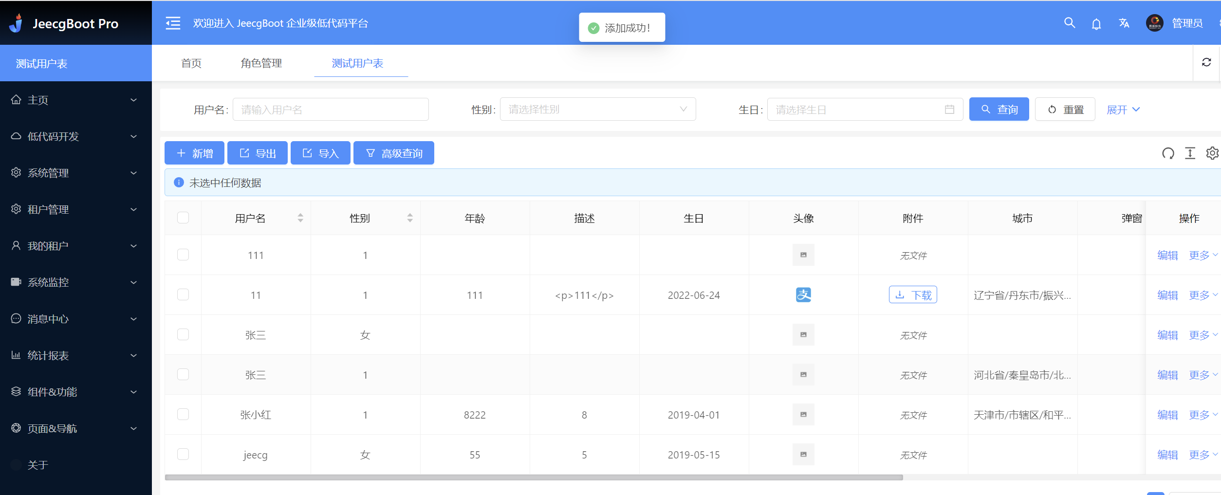 JeecgBoot 提供强大的代码生成器,让前后端代码一键生成,实现低代码开发。支持单表、树列表、一对多、一对一等数据模型,增删改查功能一键生成,菜单配置直接使用。