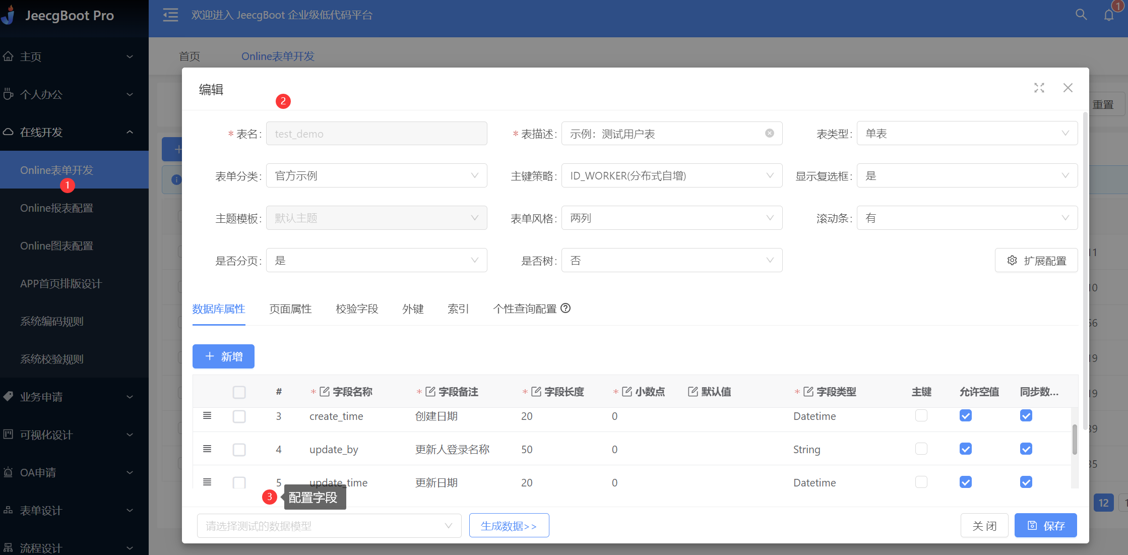 找到菜单在线开发 -> Online表单开发,在线配置表单,点击同步数据库,会在数据库生成表