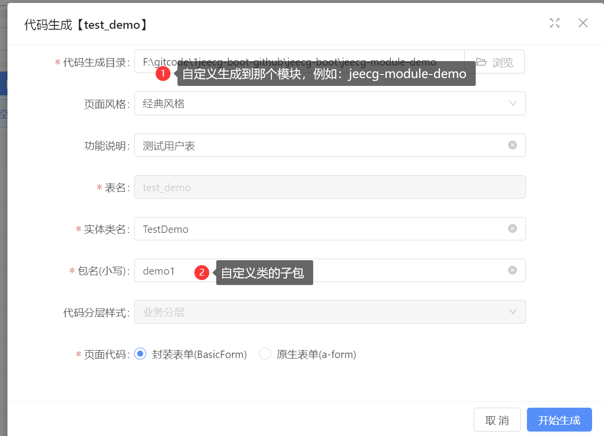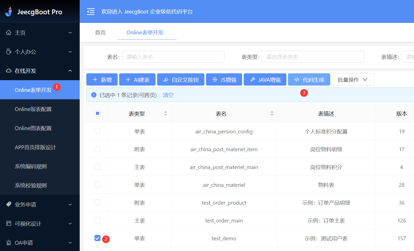 点击online表单上方的代码生成按钮,选中需要生成的表单,就可以调出代码生成的界面