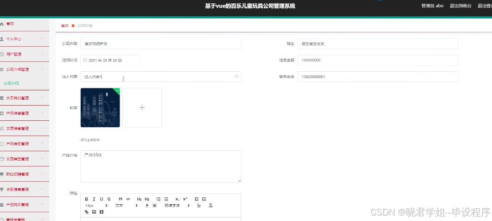 - 文章信息管理:针对文章类型进行分类,如产品宣传文章、儿童玩具安全知识文章等,并实现文章的发布、编辑、删除等功能,以满足公司的宣传和知识普及需求。