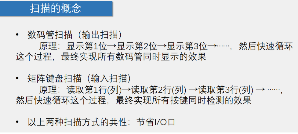 原理:读取第1行(列)→读取第2行(列) →读取第3行(列) → ……,然后快速循环这个过程,最终实现所有按键同时检测的效果。原理:跟数码管是极其相像的,扫描的过程其实是由电脑的显卡来进行扫描的这个是一个其它的一个知识点。其实对于显示器来说这个扫描的概念是非常广泛的,因为这个像素点是非常多的几乎所有的显示器都会采用矩阵来进行扫描的。