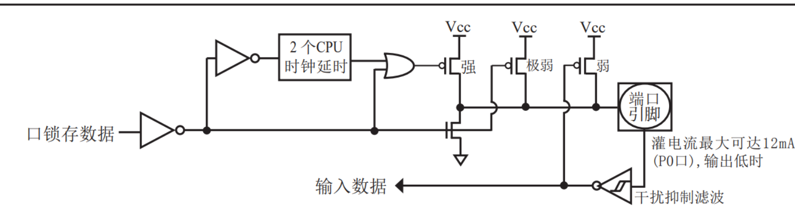 单片机的io口是一种弱上拉的模式~!又被称作是准双向口(input,output) 既可以输入又可以输出,这种就叫做是双向口。但是这种双向口有点问题:这么样才可以达到输入或者是输出呢 ?像我们这种矩阵键盘的话是不是给上,一端是0,然后读取另一头。但是另一头你怎么知道它是一种输入(高电平)呢?它其实也是作为一种输出端(低电平)它既是输出(低电平)也是输入(高电平),那么为什么单片机它的 io 口是默认为高电平呢?是因为它里面拥有一个上拉电阻把低电平变成高电平了 !所以才导致单片机是高电平,还有一个是当口线输出为1的时候驱动能力很弱,允许外部装置将其拉低。当引脚的输出为低电平的时候,它的驱动能力很强,可以吸收相当大的电流。单片机中P1、P2、P3 都是一种弱上拉的一种模式。