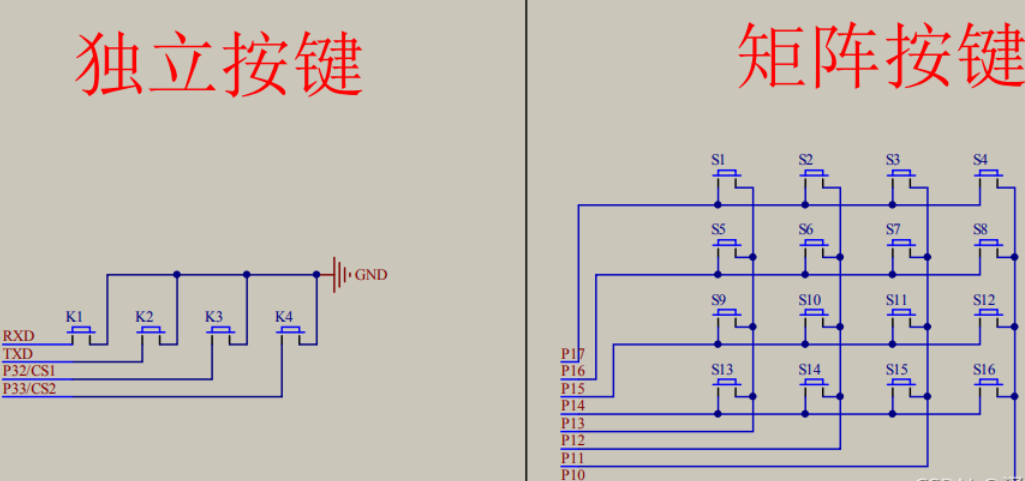 矩阵按键它是我们把①行④个单独的去拿出来看一下(S1、S2、S3、S4)这一行它的公共端它如果说把它连接到GND(P17~P14)如果不要了的话。会发现这个矩阵键盘其实就是和我们说的独立按键是一模一样的!