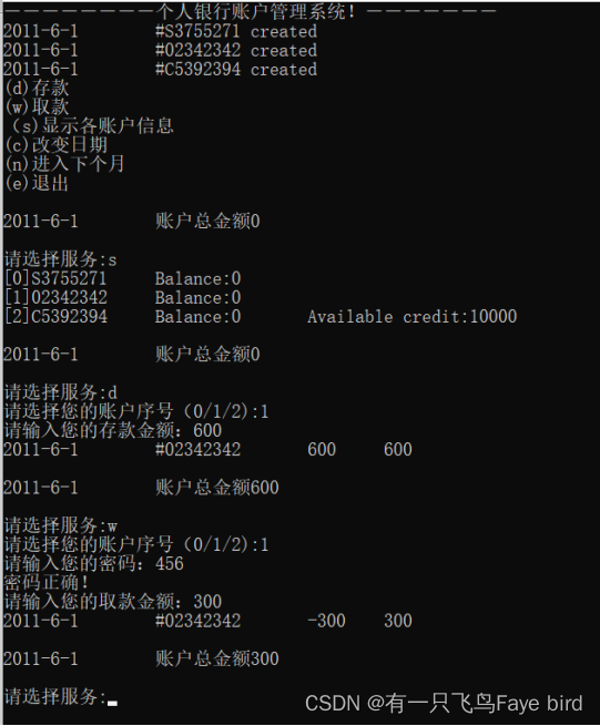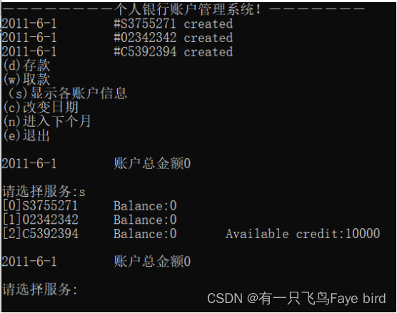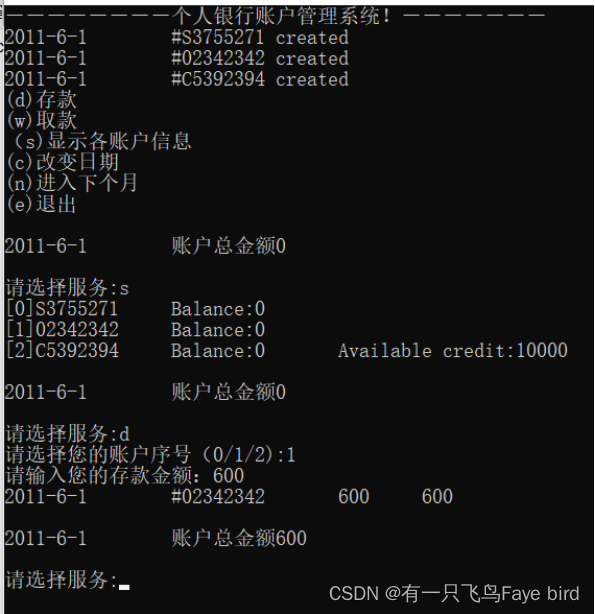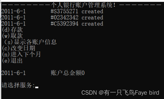 主要导航栏有:个人银行账号管理系统,已存入三个账户的信息,有六个服务包括存款、取款、显示个账户信息、改变日期、进入下个月、退出。