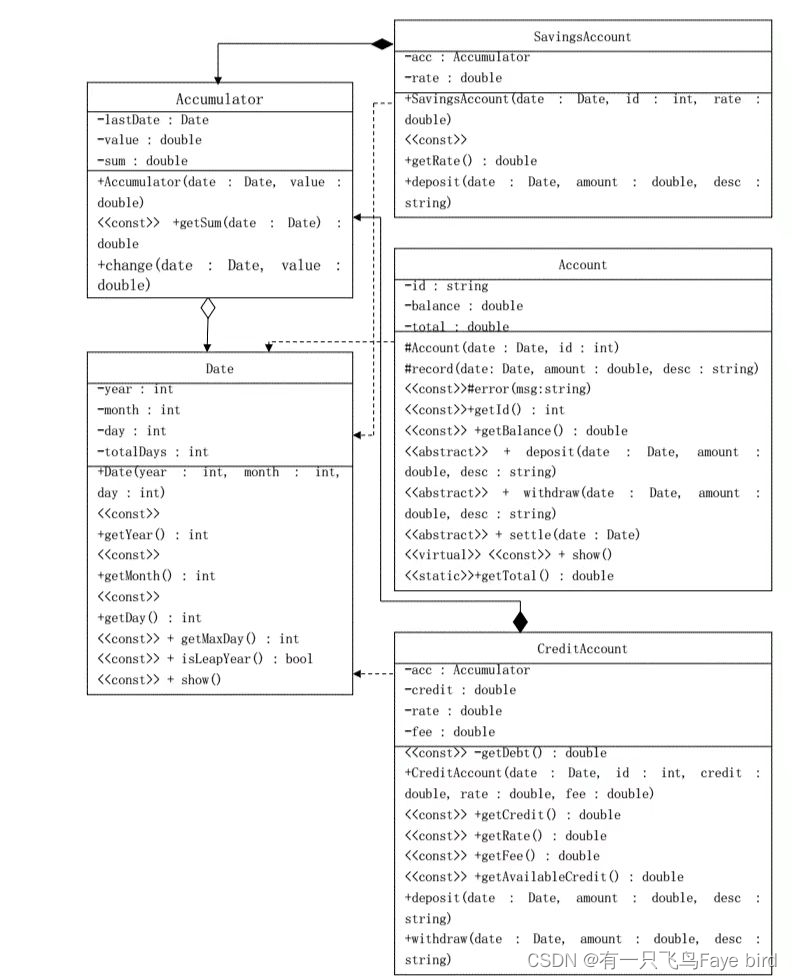 熟悉C++工程开发的过程、头文件和源文件之间的关系,掌握类、继承及派生、虚函数、多态性在C++面向对象程序设计中的体现,掌握一个类的对象作为另外一个类的成员的实现方法。掌握子类对象与父类对象的关系,熟悉C++中流的使用,养成良好的编程习惯。在掌握C++面向对象程序设计方法的基础上,使用DEV C++结合课本内容完成以下内容的实现:完成个人银行账户管理程序的编写、编译、调试、运行,完成基类Account、子类 SavingsAccount 及CreditAccount的声明及定义。实现Accumulator类及Date类。利用C++中流的概念实现账户信息的存储。在Account类中添加数据成员:Password,并对应编写该数据成员的get函数。在主函数中实现账户对象创建时从键盘输入构造函数需要的信息。在输出及需要用户输入的时候要给出相应的提示信息。