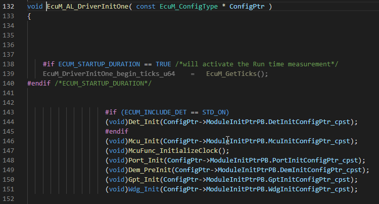 通常每个模块会接收一个包含配置的结构体指针作为参数。某些目标平台上的非 AUTOSAR 兼容 MCAL 模块可能例外,具体请参考硬件厂商的生成代码或文档。