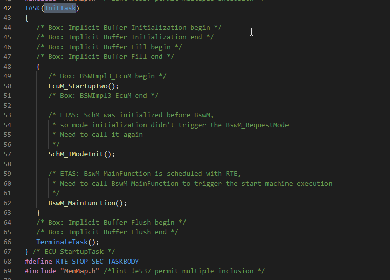 启动 OS 的调用也会触发所有配置为 Auto Start 的 OS 任务。在ETAS Starter Kit 中,唯一配置为自动启动的任务是InitTask,它不属于调度表,只在启动时执行一次。
