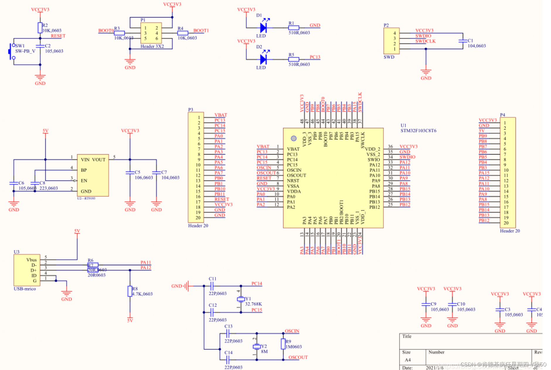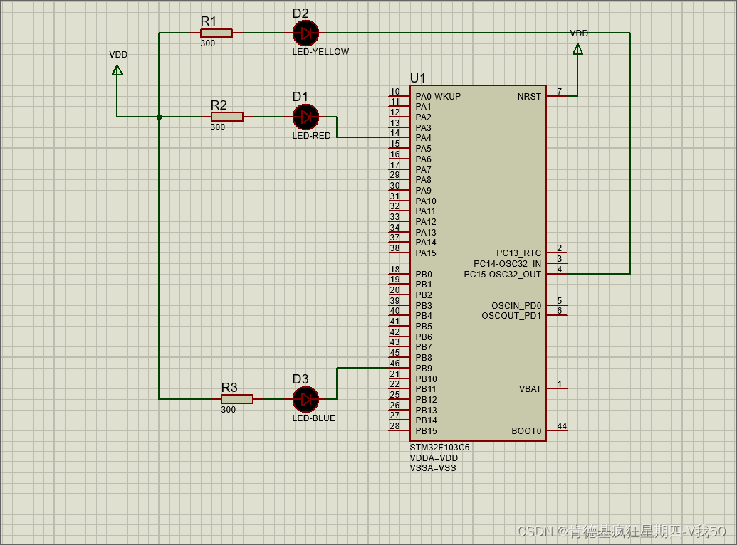 PA9/PA10: USART1的TX/RX引脚。 PA2/PA3: USART2的TX/RX引脚。 PA0/PA1: UART4的TX/RX引脚。 PB10/PB11: I2C2的SCL/SDA引脚。 PA4-PA7, PB0-PB1: 用于ADC模数转换器的模拟输入引脚。 VCC:C=circuit 表示电路的意思, 即接入电路的电压。 VDD:D=device 表示器件的意思, 即器件内部的工作电压。 VSS:S=series 表示公共连接的意思,通常指电路公共接地端电压。 VEE:负电压供电;场效应管的源极(S)。 VBAT:当使用电池或其他电源连接到VBAT脚上时,当VDD 断电时,可以保存备份寄存器的内容和维持RTC的功能。如果应用中没有使用外部电池,VBAT引脚应接到VDD引脚上。