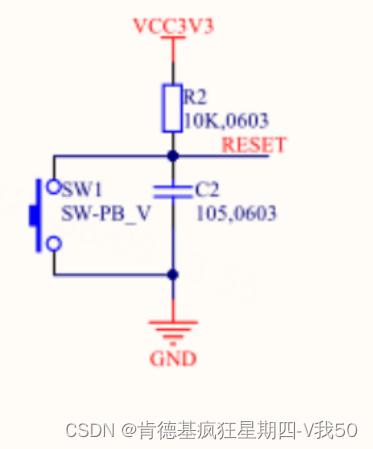 上电复位:上电瞬间,电源经过电阻给电容充电,电容充电电流最大,电容相当于短路,与地相连RST端为低电平,电路复位;当电容两端的电压达到极限值时,电容不再充电,充电电流为零,电容相当于开路,RST端与电源相连,被电源上拉为高电平。