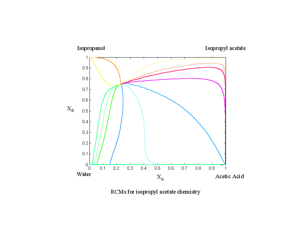这两个程序计算了大气压下乙酸甲酯和乙酸异丙酯化学物质的残余曲线图。这些计算涉及求解复杂的微分代数方程(DAE)系统。这可以使用Matlab的内置函数ode15s轻松实现。
