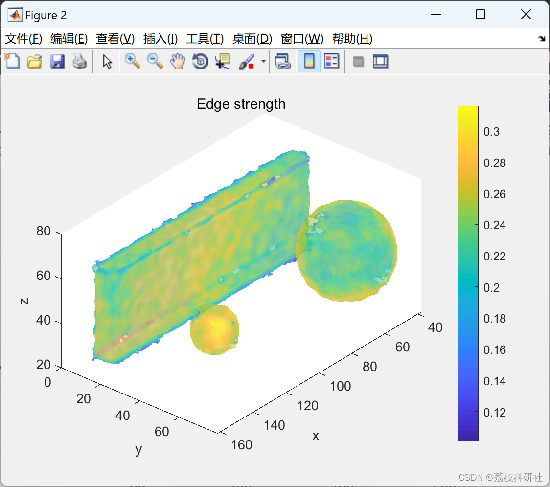 3)执行滞后阈值。首先,删除梯度幅度(边缘强度)低于下限阈值的边缘集的所有部分。然后,删除梯度幅度永远不会超过上限阈值的边缘集的所有连接分量。