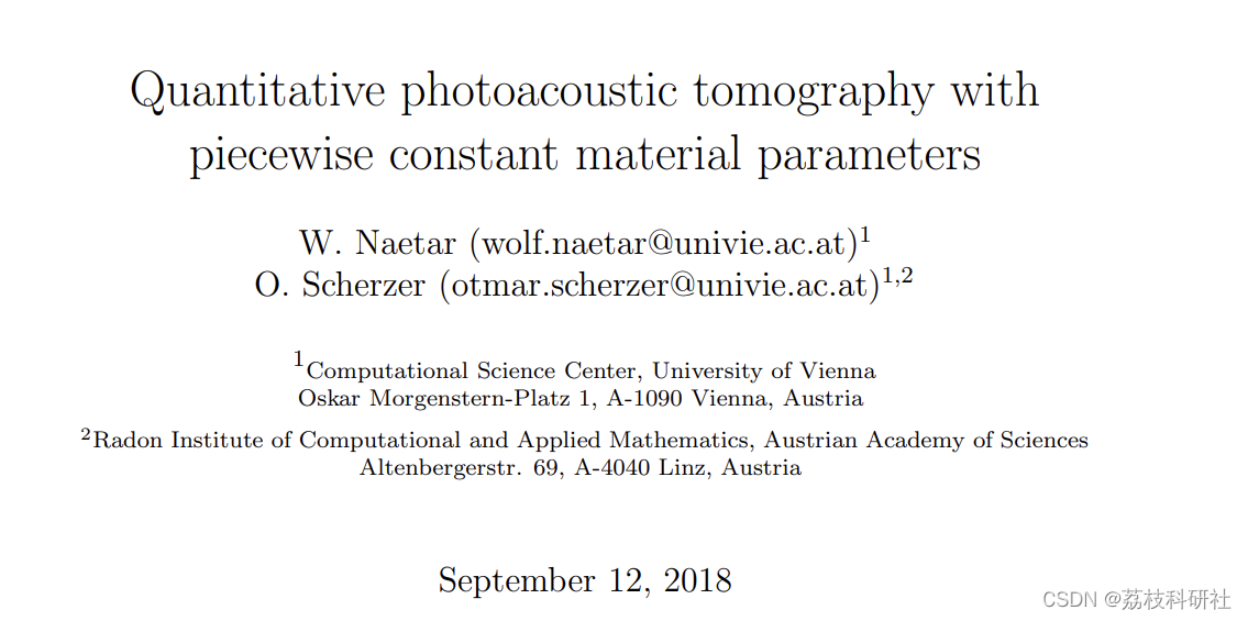 光声层析成像(PAT)是一种利用激光激发与超声测量耦合的混合成像技术。由短单色激光脉冲照射的组织产生超声信号(由于热膨胀),该信号可由介质外的超声换能器测量。从这些测量中,超声波的初始压力(其空间变化取决于组织的材料特性)可以通过求解波动方程的反问题来唯一地重建。有关此逆问题的进一步信息,请参见Kuchment和Kunyansky[23]。