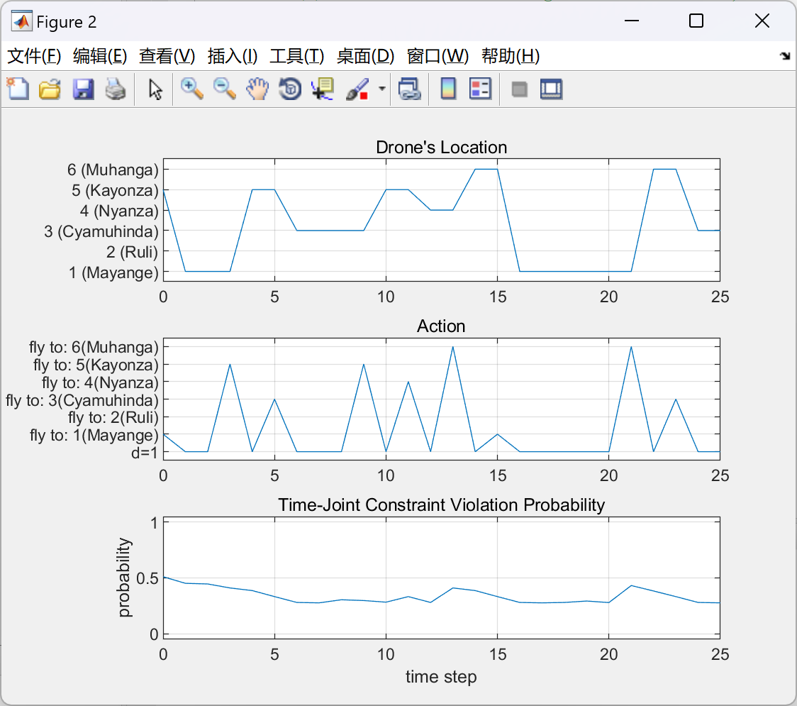 通过MATLAB代码仿真,可以得到无人机在随机环境下飞行时,状态约束违反概率的变化情况。结果表明,该随机预测控制方法能够有效地降低状态约束违反概率,并保证无人机在时间约束内完成递送任务。