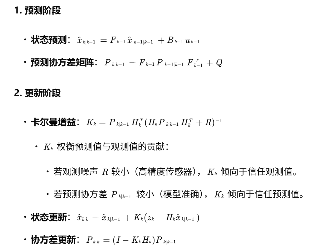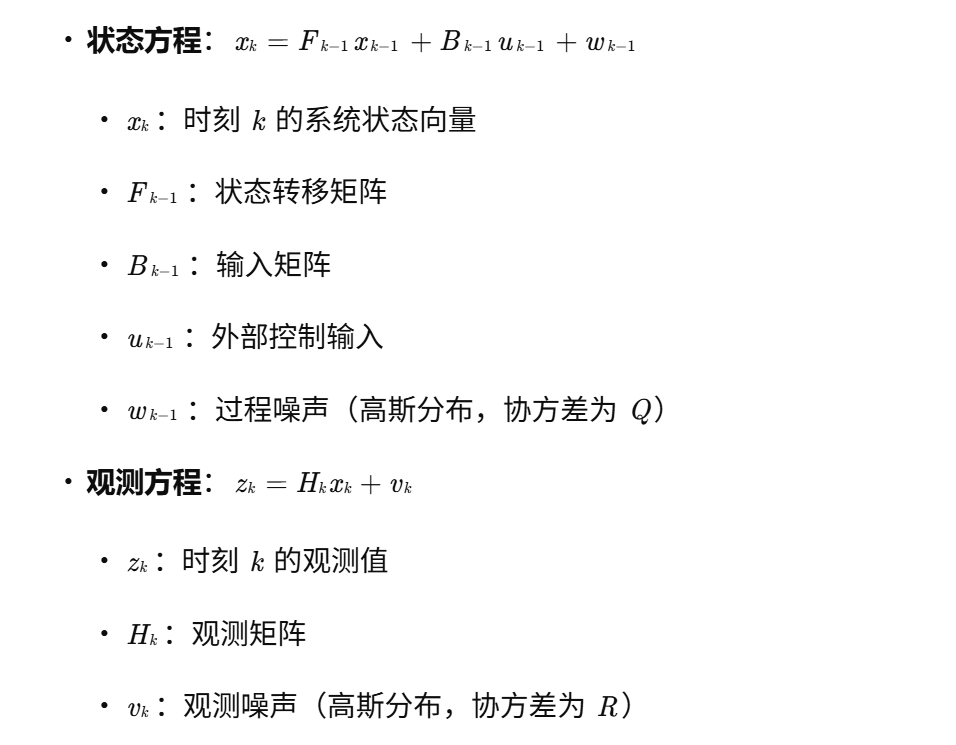 卡尔曼滤波器通过状态方程和观测方程描述系统动态与测量过程: