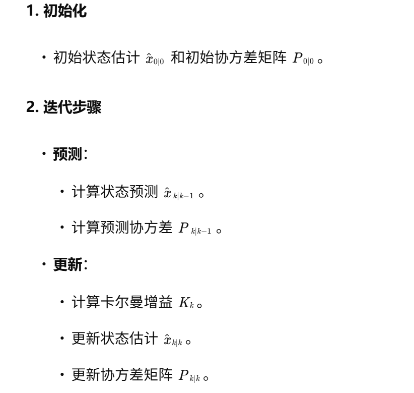 - 扩展卡尔曼滤波(EKF):处理非线性系统,通过泰勒展开线性化模型。