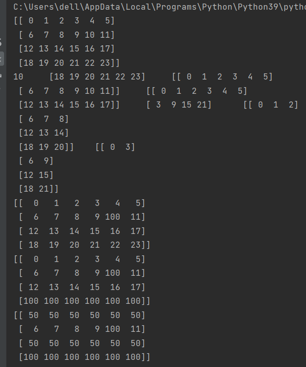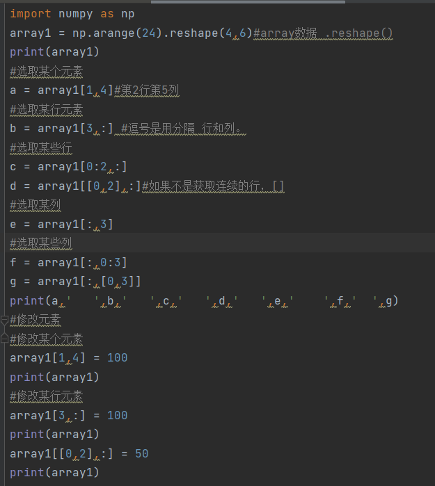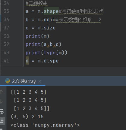 例如这里c变量,2和:之间的逗号意思就是分隔行和列的,整体意思就是选取0~2行不包含2,的全部列数据,这里的:如果不是数字是冒号就代表全部,再举一个例子,这里的e变量表示的就是全部行的第三列的数据