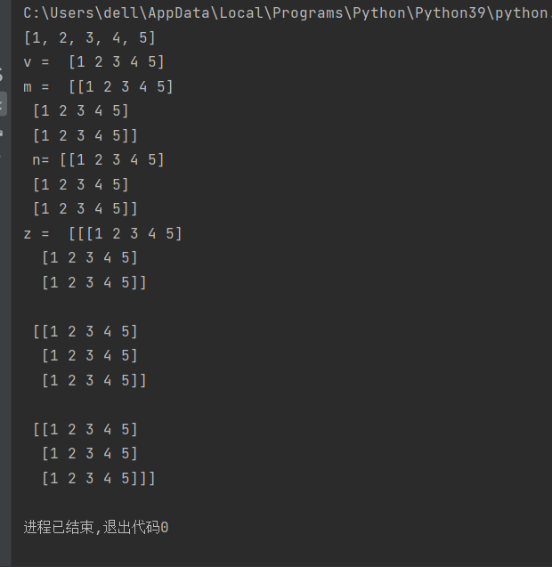 都很好理解,只有这个shape,v.shape这里是(5,)是对一维数组的特殊表达方式,根据对m的shape理解,(3,5)表示三行五列,或许v的shape能写为(1,5)意思为一行五列,但其实这是错误的。
