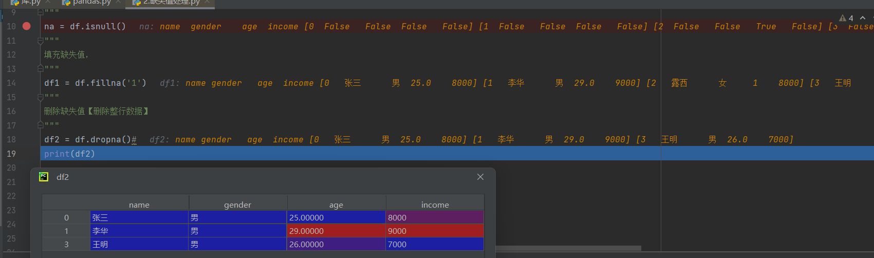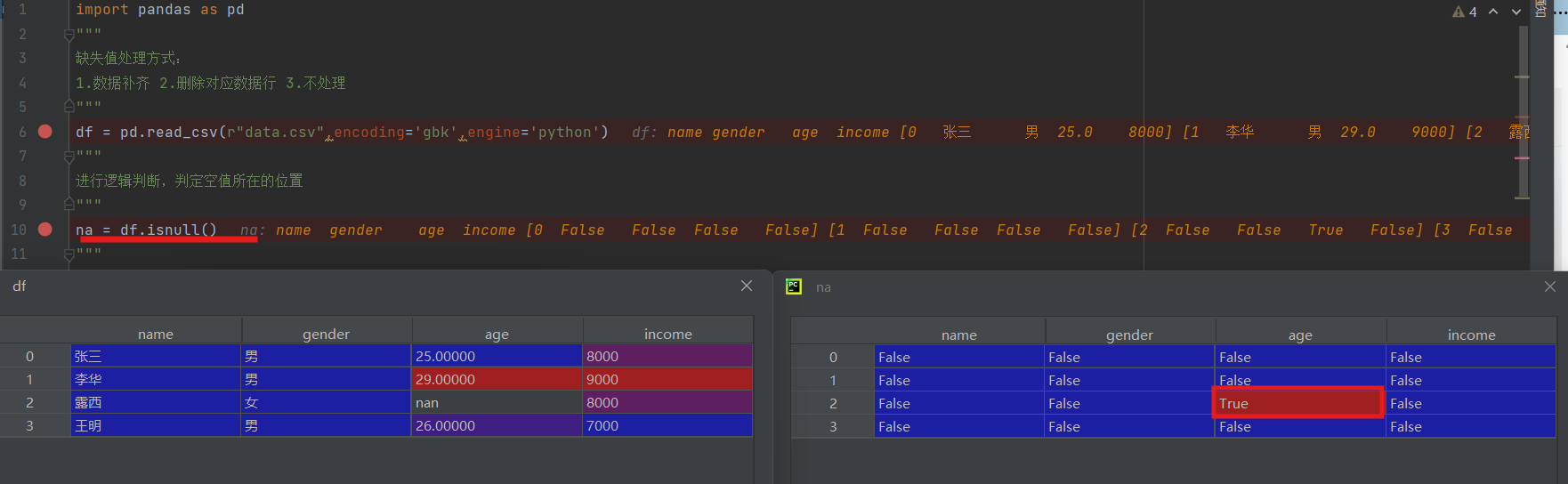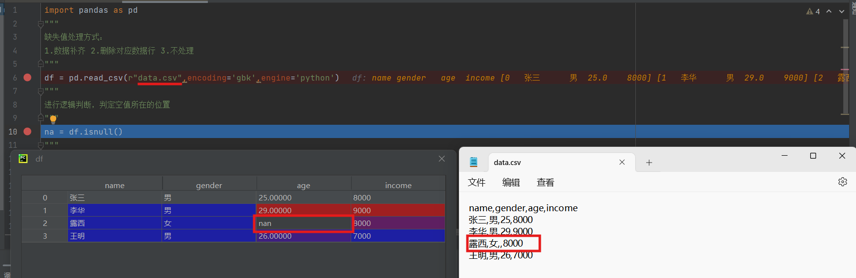 读取文件,在调试中打开df表格,原文件中第三行数据缺失一个数据,df表中缺失位置是none