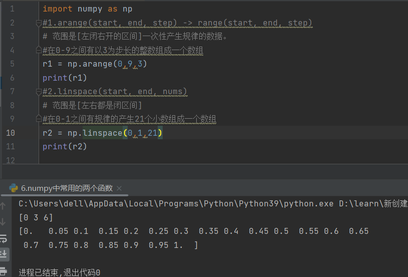 arange(参1,参2,参3):前俩数是取值范围,左闭右开,参3为步长
