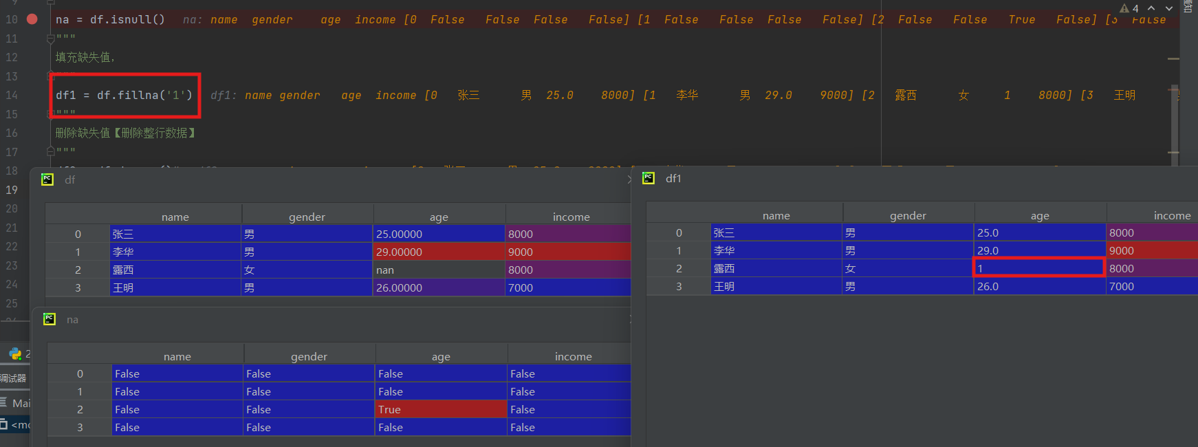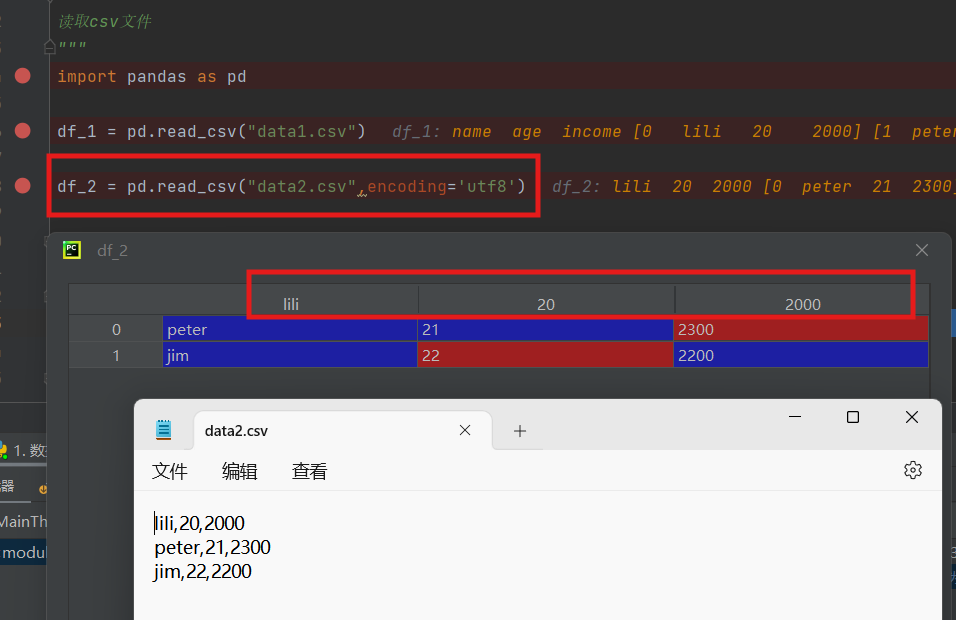 进行调试,下图中的df_1和df_2表格都是通过调试得来的,点击红框蓝色部分字体就可以打开