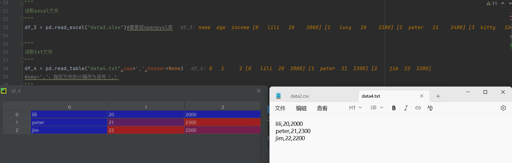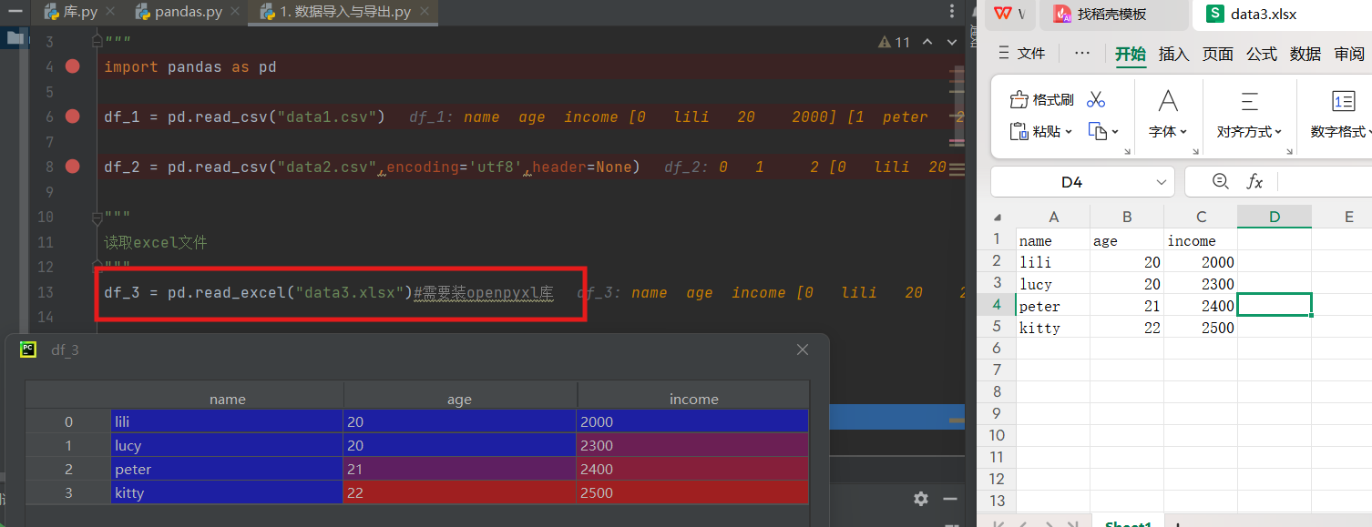 继续运行读取data3文件(注意执行df_3这条命令前我们需要先下载openpyxl库)