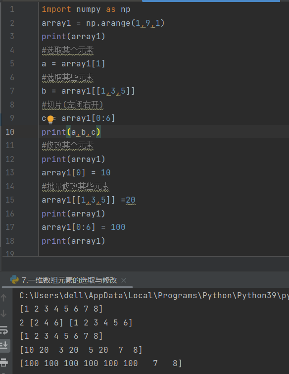冒号为范围,例如这里的c变量,取索引号0~6,不包含6的元素