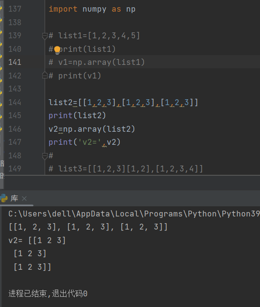 array的功能就是把列表转化为矩阵,让其数据又数学计算的功能。注意转化为矩阵的时候列表需要是“规整的”