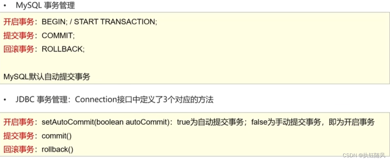 JDBC(基于Mysql数据库) 预编译sql的执行sql对象:防止sql注入 PreparedStatement prepareStatement(sql)int excuteUpdate(sql):执行DML和DDL语句(简单理解为:增加,删除,更新操作)xxx:数据类型 如:getint(参数) getString(参数)普通执行sql对象 Statement createStatement()ResultSet excuteQuery(sql):执行DQL语句。另外把查询的对象(ResultSet)的数据放到集合里面。