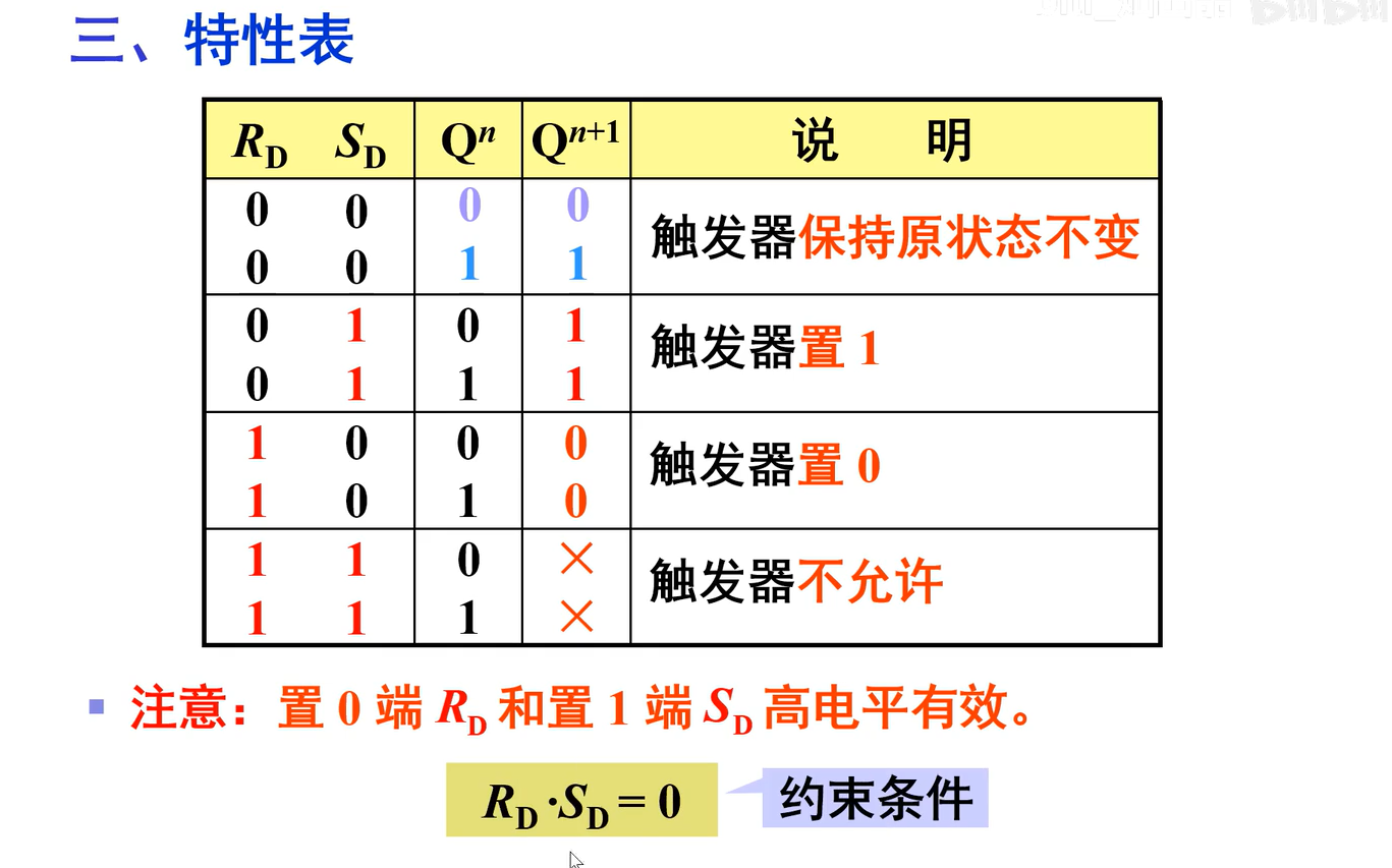 目录 说明: 1. 电路组成 2. 逻辑功能 3. 特性表 4. 特性方程 5. 例题 6. 两种基本RS触发器的形式比 说明: 笔记配套视频来源:B站;本系列笔记并未记录所有章节,只对个人认为重要章节做了笔记;标题前面的数字标号就是对应的视频章节,请大家自行对应学习 1. 电路组成 2. 逻辑功能 3. 特性表 4. 特性方程 5. 例题 6. 两种基本RS触发器的形式比较