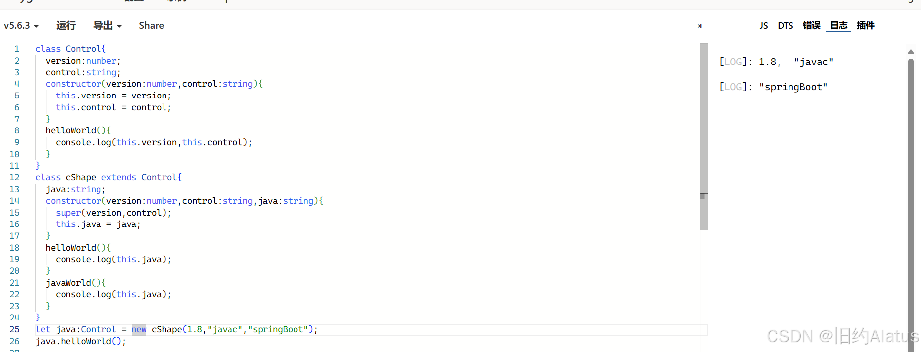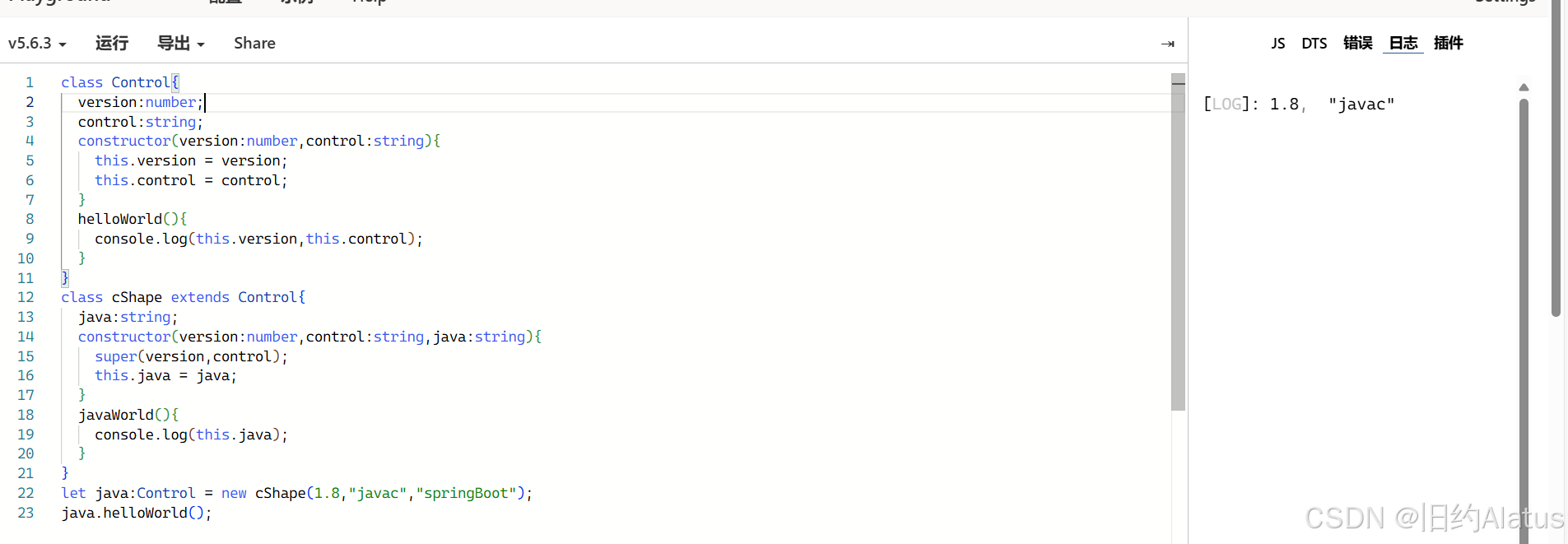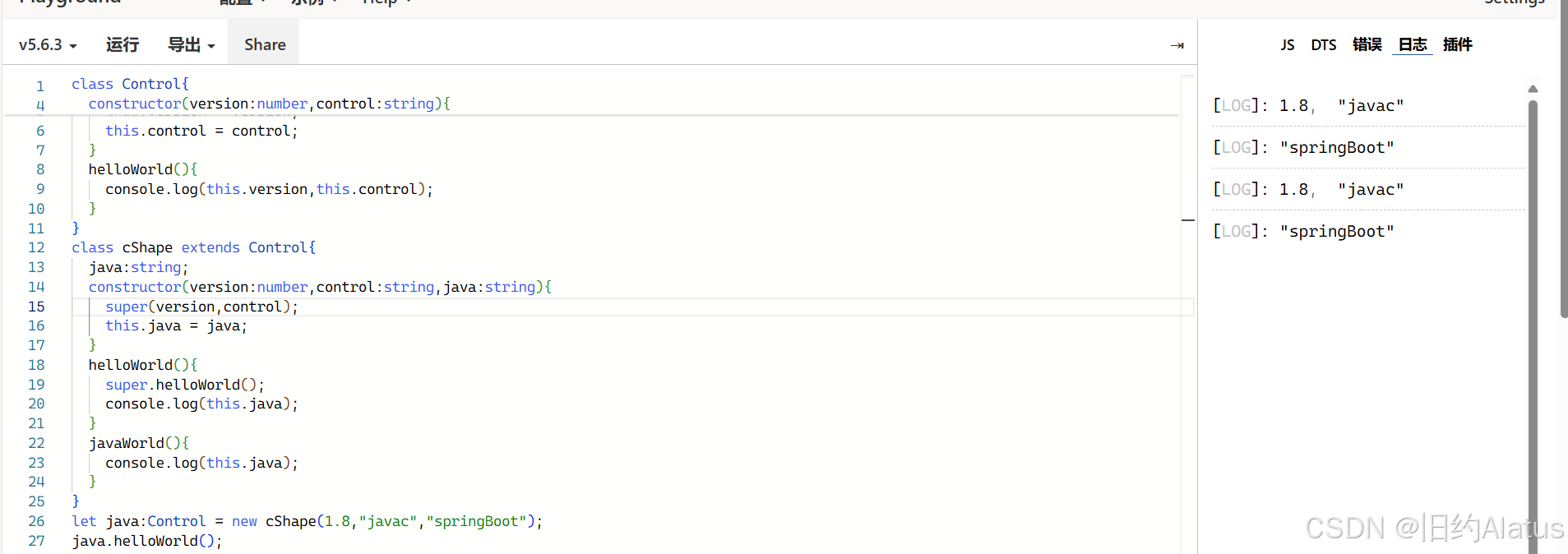 class Control{ version:number; control:string; constructor(version:number,control:string){ this.version = version; this.control = control; } helloWorld(){ console.log(this.version,this.control); } } class cShape extends Control{ java:string; constructor(version:number,control:string,java:string){ super(version,control); this.java = java; } javaWorld(){ console.log(this.java); } } let java:Control = new cShape(1.8,"javac","springBoot"); java.helloWorld();