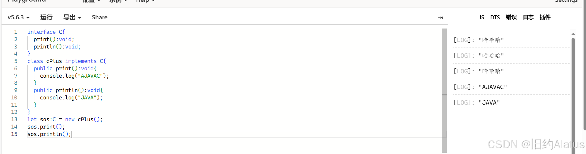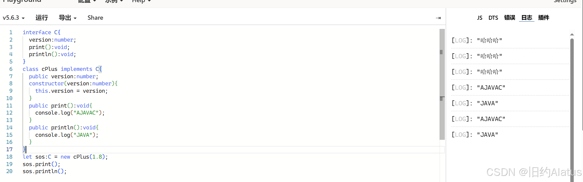 interface C{ version:number; print():void; println():void; } class cPlus implements C{ public version:number; constructor(version:number){ this.version = version; } public print():void{ console.log("AJAVAC"); } public println():void{ console.log("JAVA"); } } let sos:C = new cPlus(1.8); sos.print(); sos.println();