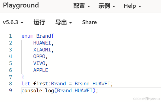 enum Brand{ HUAWEI, XIAOMI, OPPO, VIVO, APPLE } let first:Brand = Brand.HUAWEI; console.log(Brand.HUAWEI);