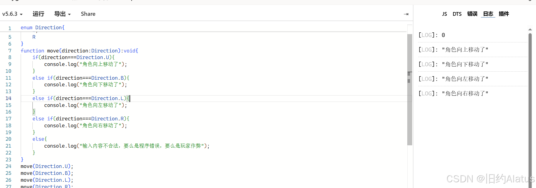 enum Direction{ U, B, L, R } function move(direction:Direction):void{ if(direction===Direction.U){ console.log("角色向上移动了"); } else if(direction===Direction.B){ console.log("角色向下移动了"); } else if(direction===Direction.L){ console.log("角色向左移动了"); } else if(direction===Direction.R){ console.log("角色向右移动了"); } else{ console.log("输入内容不合法,要么是程序错误,要么是玩家作弊"); } } move(Direction.U); move(Direction.B); move(Direction.L); move(Direction.R);