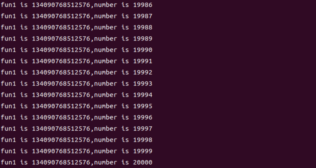 printf("fun1 is %ld,number is %d\n",pthread_self(),number);