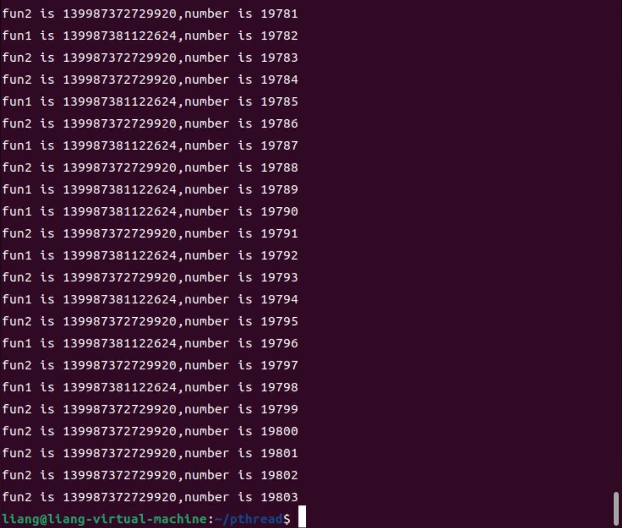 printf("fun2 is %ld,number is %d\n",pthread_self(),number);