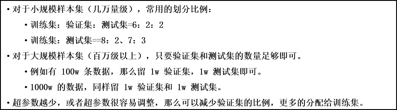 - 验证集不像训练集和测试集,它是非必需的。如果不需要调整超参数,就可以不使用验证集,直接用测试集来评估效果。