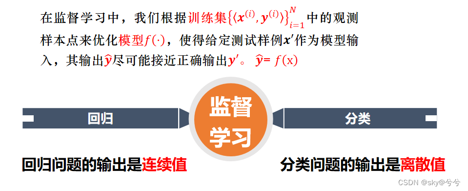 - 在无监督学习中,数据集{x^(i)}_i=1^N中只有模型的输入,而并不提供正确的输出y^(i)作为监督信号