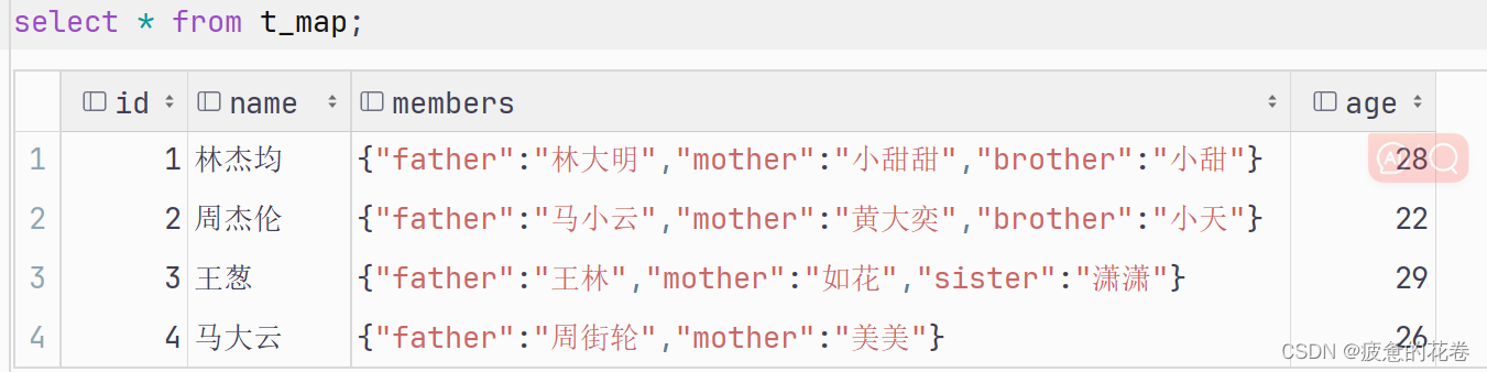 insert into t_map(id,name,members,age) values(18,邓紫棋,member('father:XXX,mother:XXX,brother:XXX'));