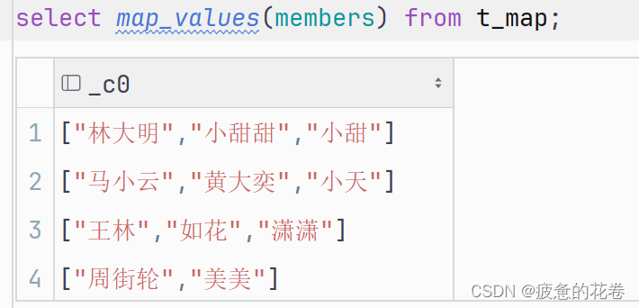 --array_contains(列名,'查询的值'),查询数组中是否包含‘tianjin’返回结果为 true/false